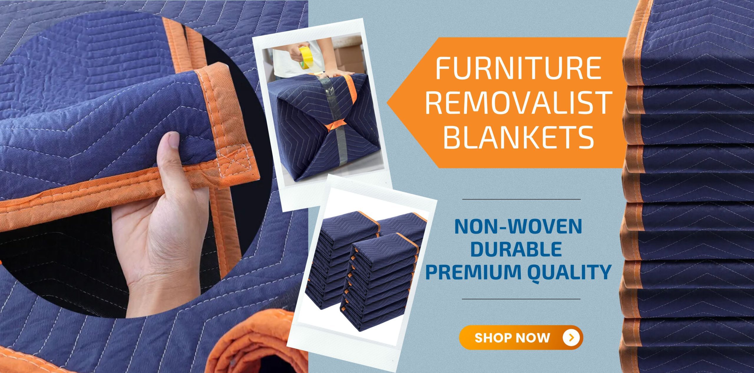 Commercial-grade, non-woven moving blanket with thick cotton fibre felt lining and zigzag stitching for enhanced durability, shock absorption, and sound insulation.