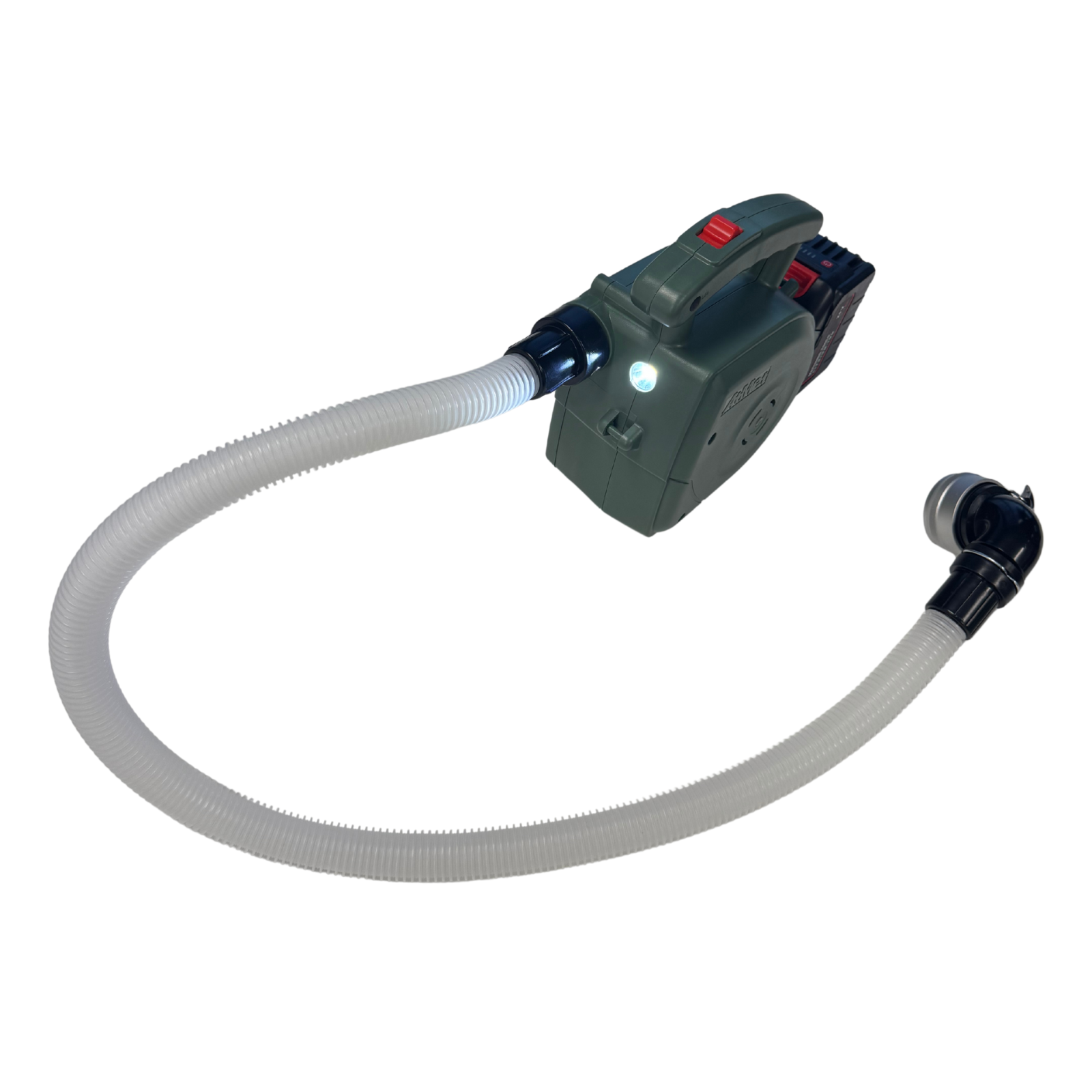 Because the hose connector is interchangeable, maintenance and part replacement is simple. The inflator runs continuously for more than 40 minutes per charge and has a preset pressure output of around 0.07 bar.