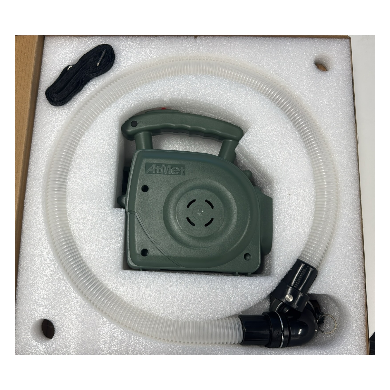 The unit features a durable ABS body and is lightweight for easy handling. It includes a carry strap and built-in LED light for working in darker spaces such as containers or trucks. The onboard battery indicator helps monitor usage, and the unit also offers a deflation mode when needed.